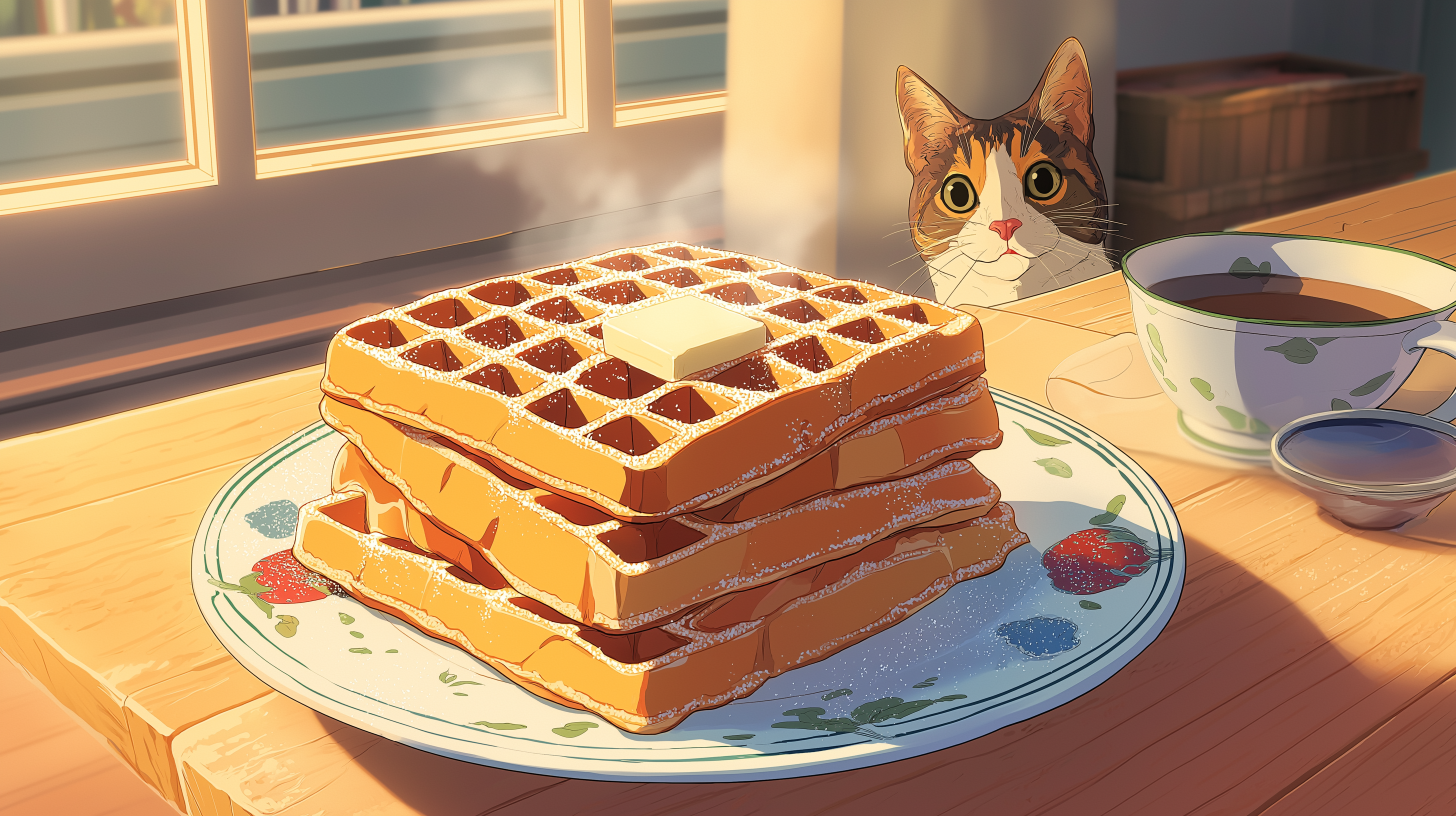 Waffle Cat captures the comfort of a buttered waffle breakfast with a sunlit tabby purring on your lap. Warm amber tones and soft neutrals create a calm workspace without sacrificing clarity and contrast.